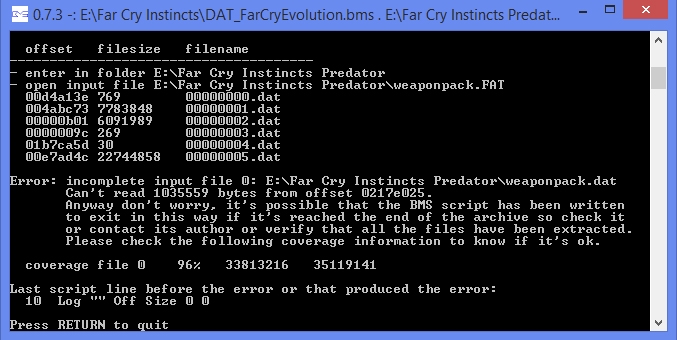 For Far Cry Instincts, Evolution and Vengeance is have a BMS script. But Instincts Predator archives extracting with "incomplete Input" error, if using this script. Some files is extracting, but wrong.